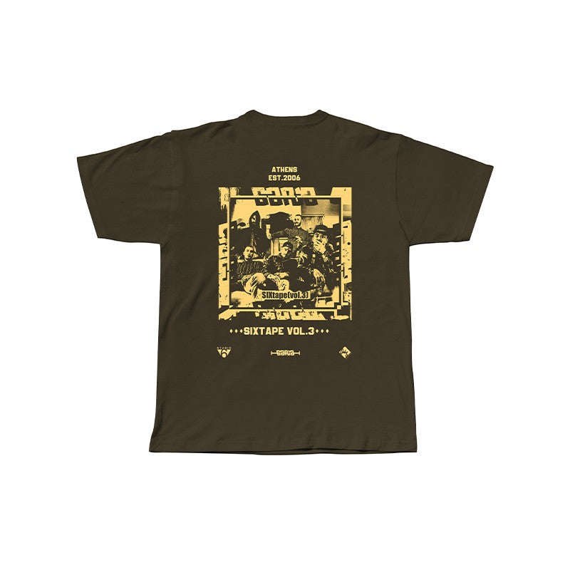 Χακί t-shirt 6αρια στο μπροστά μέρος το logo 6aria και γραφιστικό Six Tape volume3 στο πίσω μέρος.