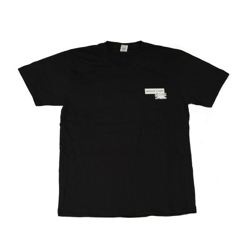Μαύρο t-shirt Smuggler x Long3 με λευκό σήμα στο μπροστά μέρος και σχέδιο από το tour με τα πρόσωπα των καλλιτεχνών στο πίσω μέρος.