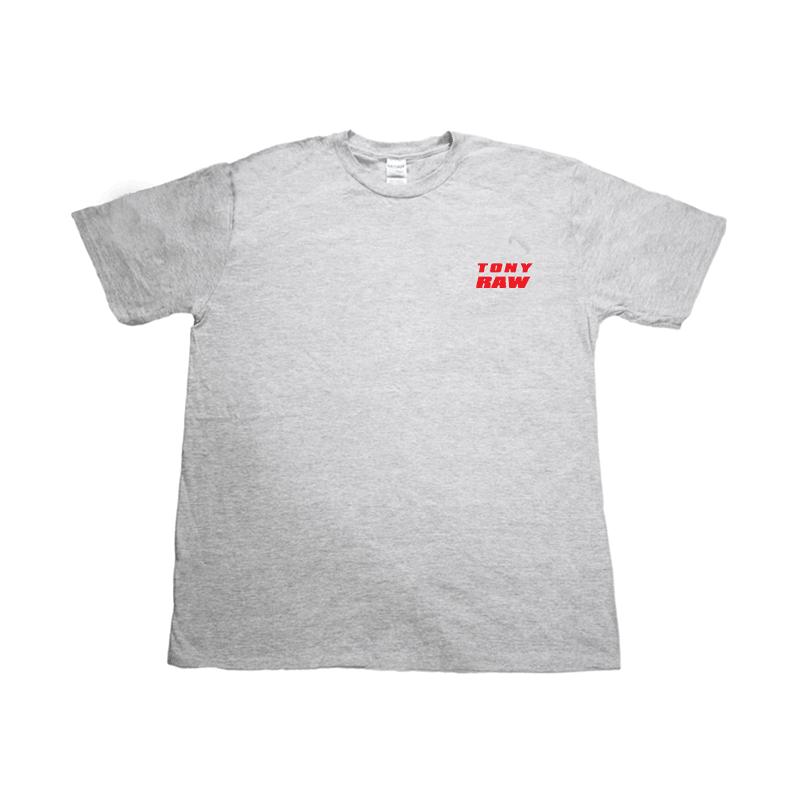 Γκρι t-shirt Tony Raw, με κόκκινο το λογότυπο στο μπροστά μέρος και το Khaki στο πίσω.